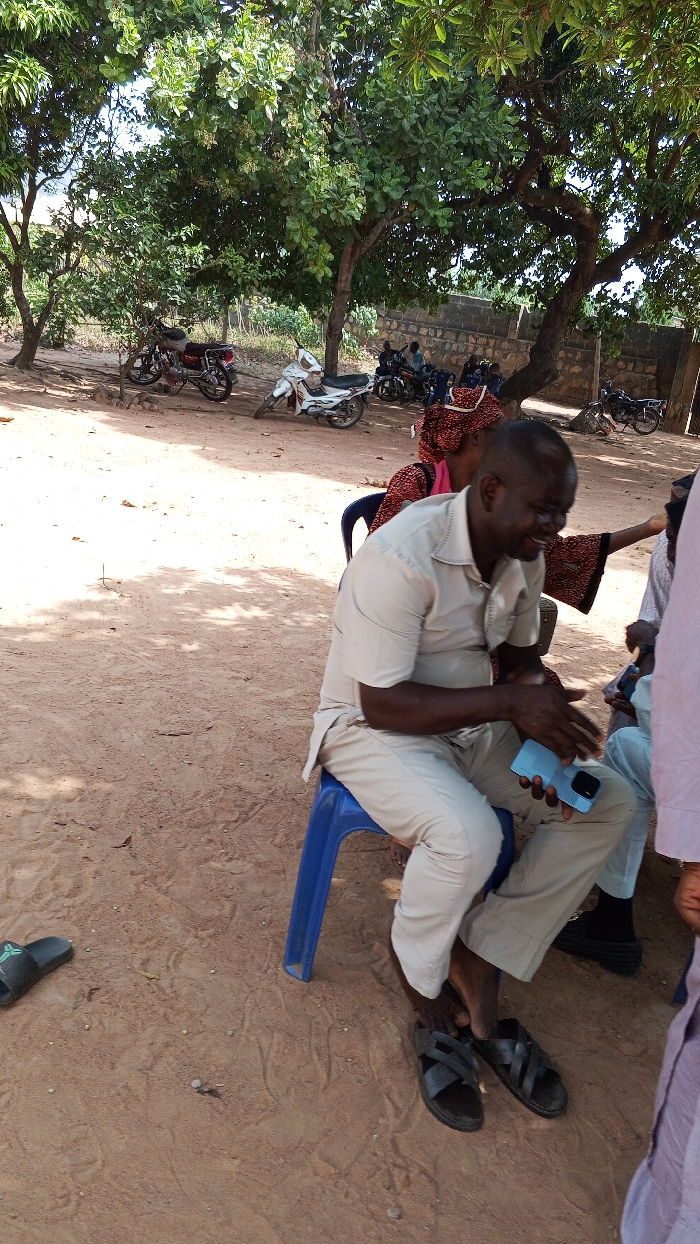 The scene, located in Ogbono, Nigeria, depicts an outdoor gathering under significant tree cover on a dirt ground, illuminated by bright daylight. In the foreground, a dark-skinned male, wearing a tan short-sleeved collared shirt and matching trousers, is seated on a blue plastic stool. He displays a wide smile, looking towards the right side of the frame, and holds a light blue smartphone in his left hand. He wears black cross-strap sandals. A single black slide, bearing a green logo, lies on the ground to his left. Partially visible behind him to the left is a female individual wearing a red and white patterned headwrap and attire, also seated. In the midground, several motorcycles are parked beneath additional trees, including a red motorcycle and a white scooter. Multiple other individuals are discernible in the background, some seated near the parked motorcycles. A low stone wall is visible in the distant background. Shadows on the ground suggest an overhead light source.