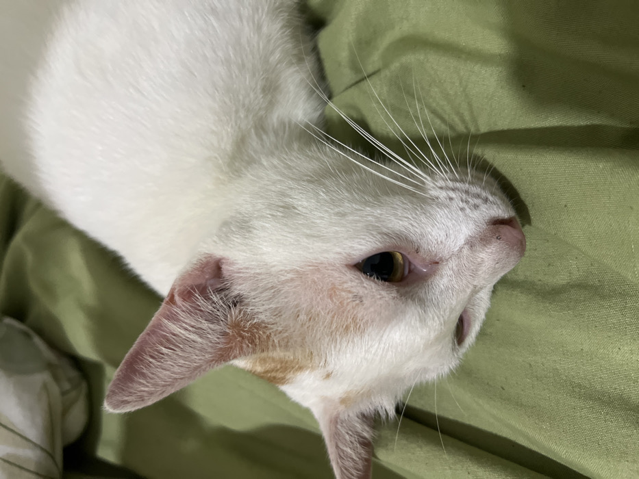 - "A white domestic cat with light orange patches on its left ear and forehead is depicted lying on its left side, its head resting on a light olive-green fabric surface" by FM-gZMgt2, licensed under CC BY 4.0