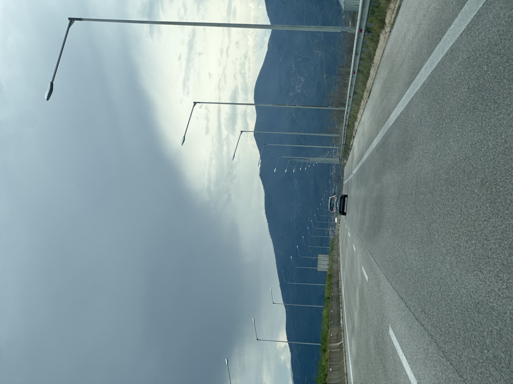 The image depicts a highway, possibly near a mountainous region, in Unknown, Greece. The highway stretches into the distance, featuring multiple lanes marked by white lines. A car can be seen further down the highway. A series of streetlights line the side of the road, running parallel to a mountain range. The sky is cloudy with varying shades of gray. Vegetation grows along the roadside.