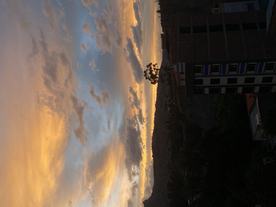 The image displays an urban landscape at dusk or dawn in La Paz, Bolivia, characterized by a dramatic sky and a mountainous backdrop. The sky occupies the upper two-thirds of the frame, featuring altocumulus and stratocumulus clouds illuminated by a low sun, casting vibrant orange and golden hues across large sections, interspersed with areas of lighter blue and gray. In the mid-ground, a range of hills and mountains defines the city's topography, mostly silhouetted against the bright horizon. Small structures and faint lights are visible on these distant slopes, indicating urban sprawl. A prominent, solitary tree with sparse foliage stands near the center-right, also silhouetted. Below this, a valley or depression is visible, covered in dark foliage and shadows. The foreground is dominated by parts of urban buildings. On the right, a multi-story building, likely under construction or partially finished, shows exposed brickwork on one side and a facade with multiple windows, some tinted blue, on another. To its left, a lower building with a lighter roof is partially visible. Further to the left, dark masses of vegetation indicate a lower-lying area or ravine. No people or discernible actions or interactions are visible within the frame. The overall scene depicts a transitional time of day in a high-altitude urban environment.