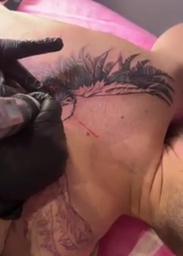 A tattoo artist with black gloves is tattooing a man's upper body. The man lies on his back on a pink surface. The artist, standing to the side, uses a tattoo machine to fill in the design of what appears to be leaves on the man's upper chest and shoulder. An outline of the tattoo can be seen sketched on the man’s chest.