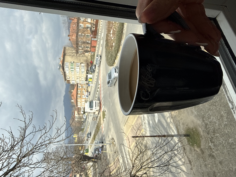The image depicts an outdoor urban scene in Kazanlak, Bulgaria, viewed from an elevated indoor perspective through a window. The location is the intersection of General Skobelev Street and Hristo Botev Street/Osvobozhdenie Street, looking northeast. In the immediate foreground, a human hand with manicured fingernails, painted a light shade, grips a dark-colored ceramic mug with "Coffee" embossed in script on its side. The mug contains a light brown liquid, indicative of coffee. The hand and mug are positioned against a white window frame, partially obscuring the lower right portion of the scene. The midground features a complex street intersection with multiple lanes, white-striped pedestrian crossings, and a central elongated traffic island. A white semi-truck with a trailer is visible traversing the intersection from left to right. A silver sedan is positioned on the right side, turning into the central island area. Other vehicles are present on various street segments. Bare deciduous trees, indicative of late autumn, winter, or early spring, line the left side of the street and partially frame the upper left. Utility poles and a street lamp are visible. Small patches of green grass and dirt are present on the median and roadside. In the background, a mix of multi-story buildings with various architectural styles is visible. A prominent light-colored apartment building with numerous windows, some equipped with external shades, stands to the right. To its left, another building shows solar panels on its roof. Further structures with red-tiled roofs are interspersed throughout the urban landscape. A range of low mountains forms the distant horizon under an overcast, heavily clouded grey sky. The overall lighting is diffused natural daylight.