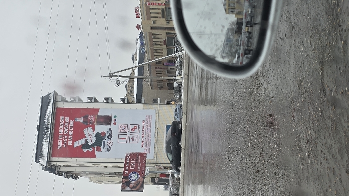 A street scene under a gray sky. On the left, a large Coca-Cola billboard dominates, showing a red background with white text in a foreign language, and various products. A street sign is below it. Cars are parked alongside the wet, gray road. A building with "HOTEL" visible on its facade stands further down the street. A side mirror of a vehicle reflects the scene in the distance.