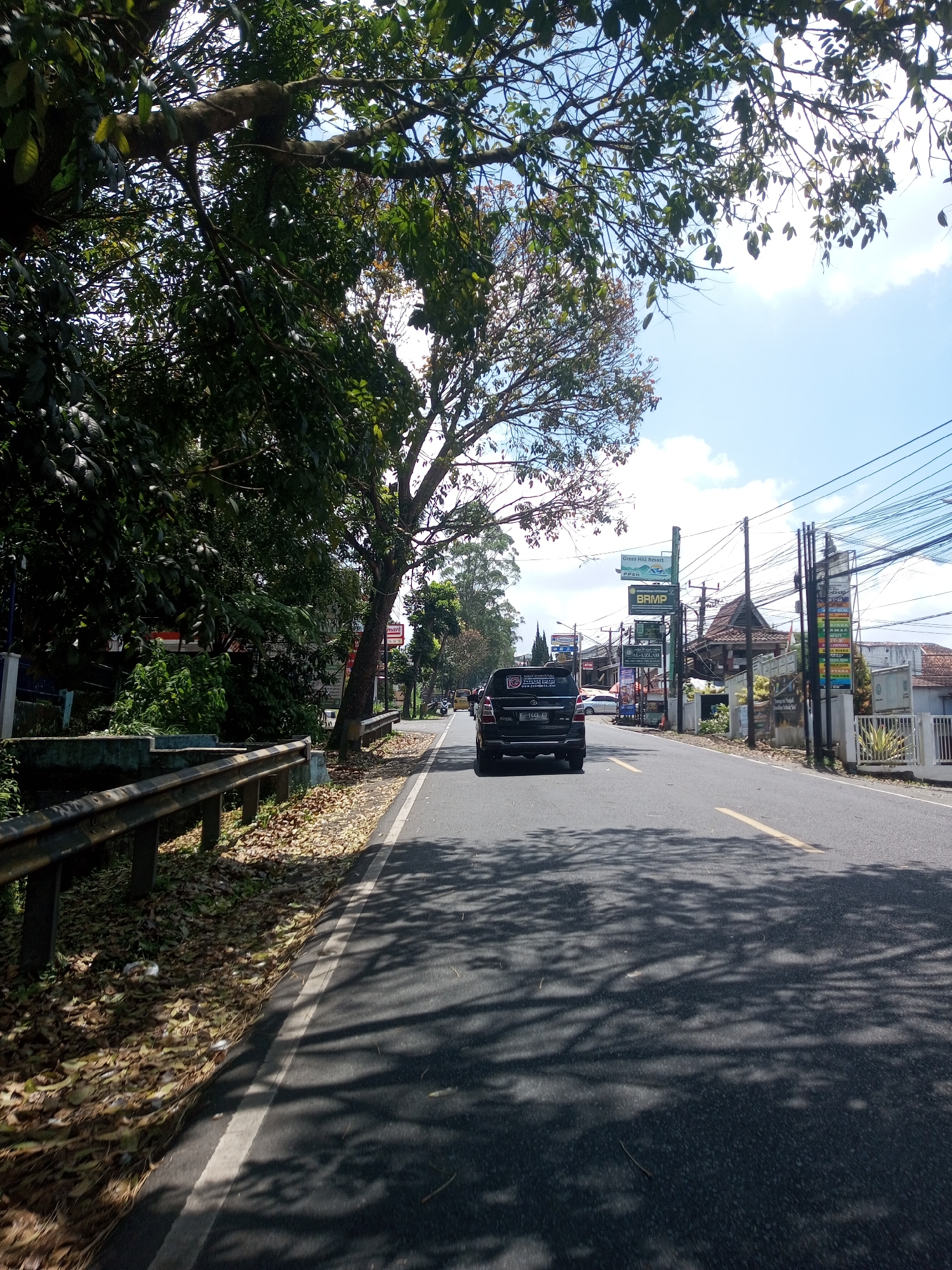 A street view captures a vehicle driving on an asphalt road marked with a white line along the left edge and tree shadows cast across the surface. The roadside includes a weathered metal guardrail and fallen leaves. On the right side of the road, there are buildings with signs, as well as power lines visible in the sky. The city is not Kioumaknao 2, Laos.
