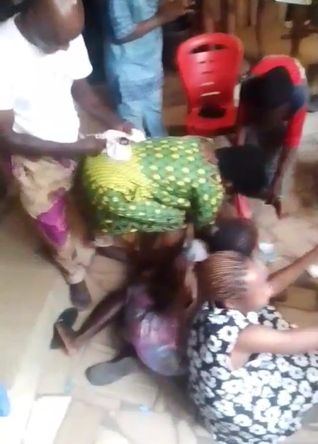 The video depicts an indoor scene with multiple individuals. Several people are gathered closely around others who are kneeling or lying on the floor. Objects on the floor and on a small table include bowls, liquids, and paper currency. The participants appear to be engaged in a ritualistic activity or ceremony. The room is casually furnished with chairs and the floor is tiled. People are interacting with gestures and movements, creating a sense of intense activity.