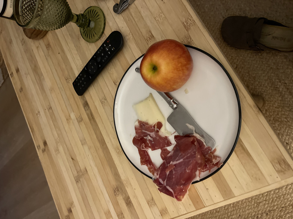 The image displays an indoor scene in Vilar, Spain, featuring a static arrangement of food and household items on a light-colored, slatted wooden table and the surrounding floor. A round white plate with a black rim occupies the central foreground, holding several thin slices of red cured meat, a triangular piece of pale yellow cheese, a silver cheese knife with a light brown handle, and a whole red and yellow apple. To the right of the plate on the table, a black remote control is visible. Further right, partially obscured, are a dark green, textured stemmed glass and the neck of a wine bottle with "RIAS BAIXAS" visible on its label. A silver corkscrew is also present on the table's right edge. The floor beneath the table is covered by a natural fiber woven rug, and a dark brown slipper is partially visible on the rug in the lower right corner. No individuals are present in the scene.