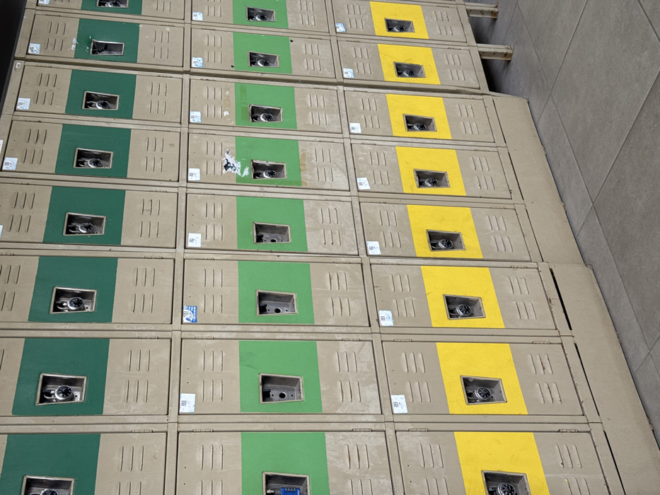 The image displays a long bank of two-tiered, beige metal lockers inside an unknown facility located in the city of Unknown, Unknown