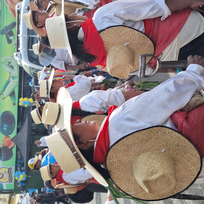 An outdoor scene in José Luis Bustamante y Rivero, Peru, depicts a group of individuals, predominantly women, engaged in what appears to be a market or cultural event under bright daylight. The foreground features several people wearing white long-sleeved shirts and red scarves draped over their shoulders. Each person wears a wide-brimmed straw hat, and many carry an additional straw hat secured to their back. One woman in the immediate foreground, facing right in profile, wears a large straw hat with a decorative brown band and gold-colored hoop earrings. Another individual in the right foreground holds a shovel with a D-handle. Red mesh bags filled with what appear to be onions and green onions are visible, carried by some individuals. In the background, a large banner displays illustrations of various vegetables including corn, pumpkins, peppers, and plantains, with the word "Metropolitana" partially visible. A dark tent, blue and yellow balloons, a white van, and additional people are also present, suggesting a bustling public environment.