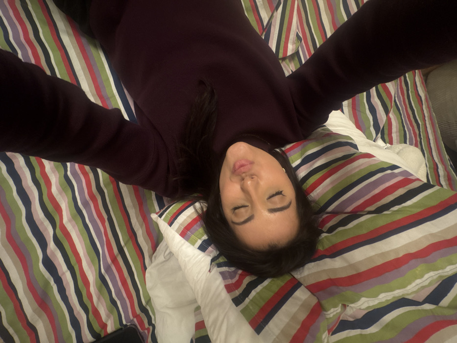 The image displays a single female individual lying supine on a bed within an indoor setting in Baden, Austria. The woman, who appears to be taking a selfie due to the overhead camera angle and arm positioning, has dark hair and is wearing a solid burgundy long-sleeved top. Her eyes are closed, and her lips are pursed. She is resting her head on a pillow. The bed is covered with multi-colored striped bedding, featuring horizontal stripes of white, red, green, blue, purple, and beige. A segment of a white duvet or blanket is partially visible near the pillow. The environment appears to be a bedroom.