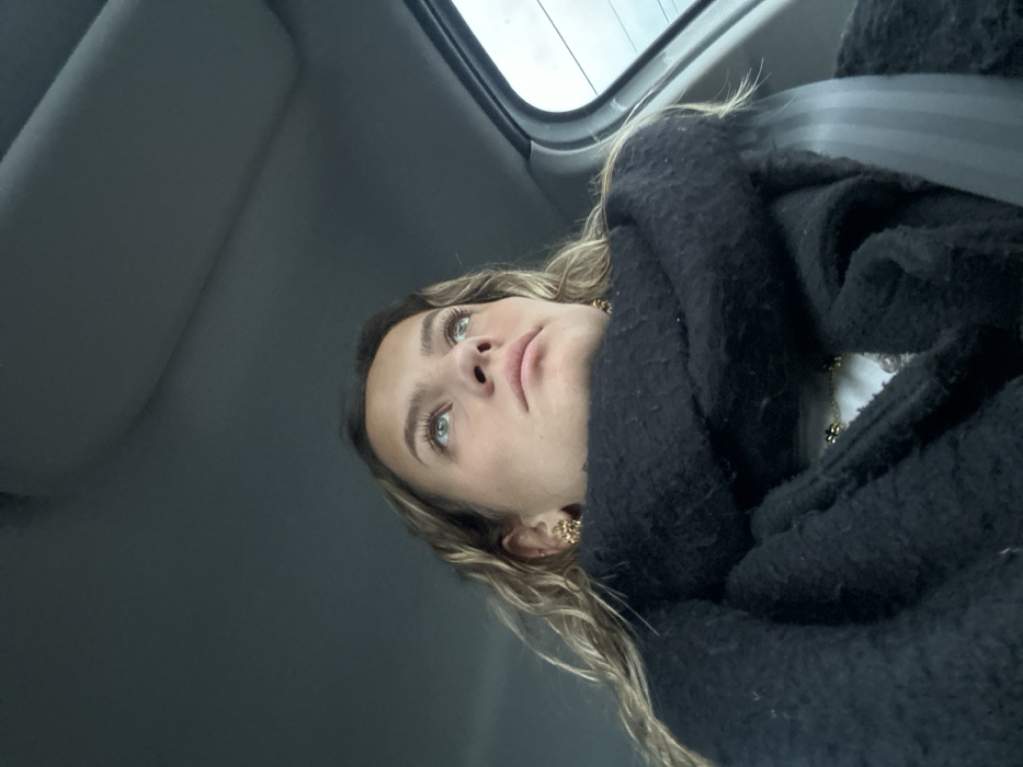 A young woman is angled upward, presumably in a car. Her blonde hair is loosely curled. She wears a black, heavy scarf and gold jewelry. Her eyes are green. The interior of the car is visible, including the ceiling, window, and seatbelt. Light is coming from the window. The overall tone is casual and candid.