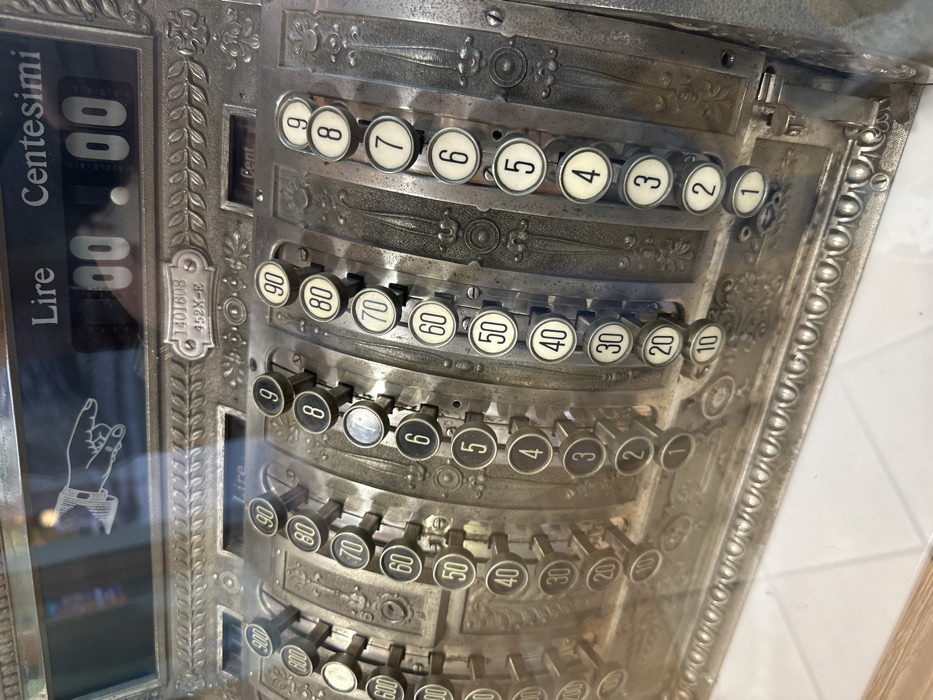 - "The image displays an antique Italian mechanical cash register, presented behind a reflective clear barrier, likely glass" by FM-A8Ieo2, licensed under CC BY 4.0