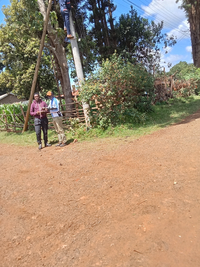 The image depicts an outdoor scene in Nyeri, Kenya, characterized by a reddish-brown dirt path under a clear blue sky with scattered white clouds. In the mid-ground, a light-colored concrete utility pole with multiple overhead wires stands upright. Adjacent to this pole is a large tree with a rough bark texture. A male individual, dressed in a dark blue long-sleeved shirt and dark trousers, is positioned approximately two-thirds of the way up the utility pole, utilizing the adjacent tree for support. His footwear appears to be light-colored sandals. On the ground below the utility pole, two other male individuals are present. The individual on the left is wearing a maroon hooded sweatshirt, dark trousers, and dark shoes. He is looking down at a small, dark rectangular object held in both hands, possibly a mobile phone. The individual on the right is wearing an orange baseball cap, a light-colored striped shirt (blue, white, and black), khaki trousers, and dark shoes. He is holding a white rectangular object with blue markings in his left hand and appears to be observing the scene. Behind the individuals on the ground, a rustic wooden stick fence runs horizontally, separating the immediate foreground from a vegetated area. To the far left, beyond the fence, a patch of green crops, resembling corn, is visible in front of a partially obscured light-colored building with a dark roof. Dense green foliage, including tall trees and bushes, forms the background on both sides of the scene.
