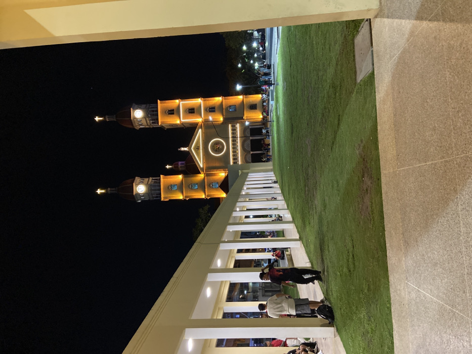 An illuminated cathedral with two towers stands tall against the night sky. A colonnaded walkway lines the left side, with people gathered beneath its shelter. Adjacent to the walkway is a grassy area with other people visible in the distance. The right side of the frame showcases a tiled wall and floor, creating a sense of enclosure. The perspective is unique, possibly taken from an elevated position.