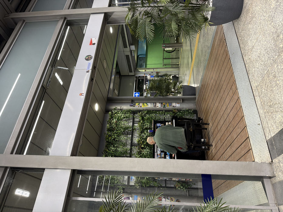 A middle-aged man in a green shirt plays a piano in an airport or train station, surrounded by foliage and bookcases