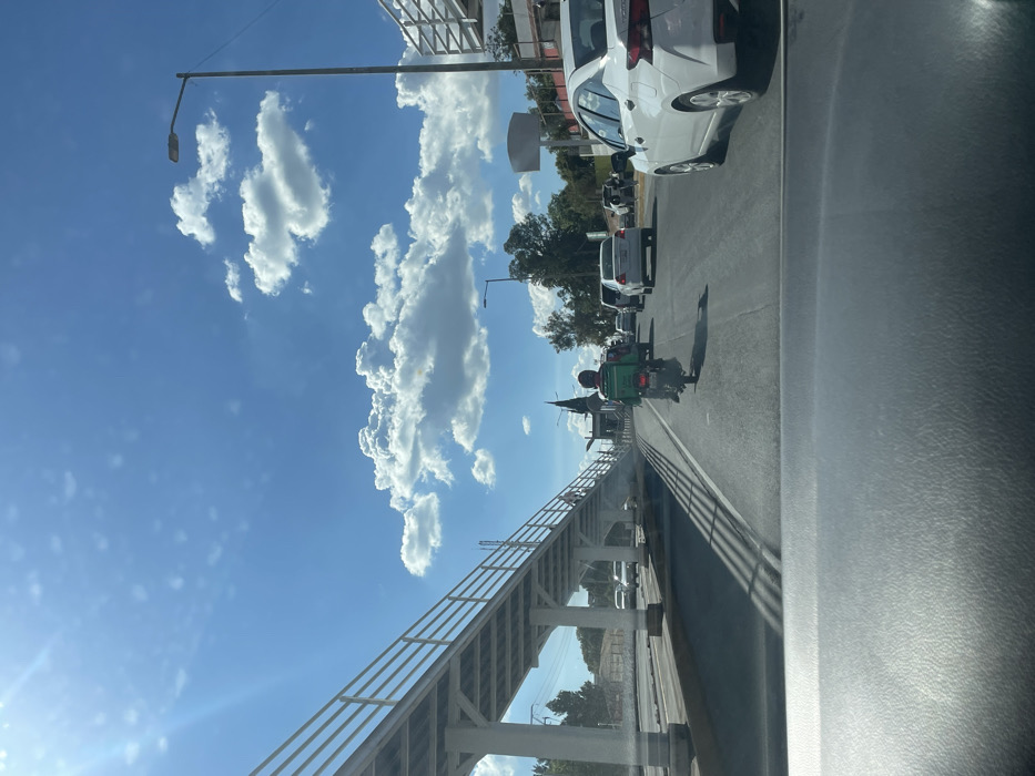 A street scene captured from inside a vehicle, possibly a car, shows a bright blue sky dotted with fluffy white clouds. A white pedestrian overpass spans the road, casting shadows on the asphalt. Traffic includes white cars and a green motorcycle with a delivery bag. A tall street lamp stands near the clouds, with additional vehicles and trees visible in the distance. The dashboard of the car takes up a significant portion of the frame on the right.