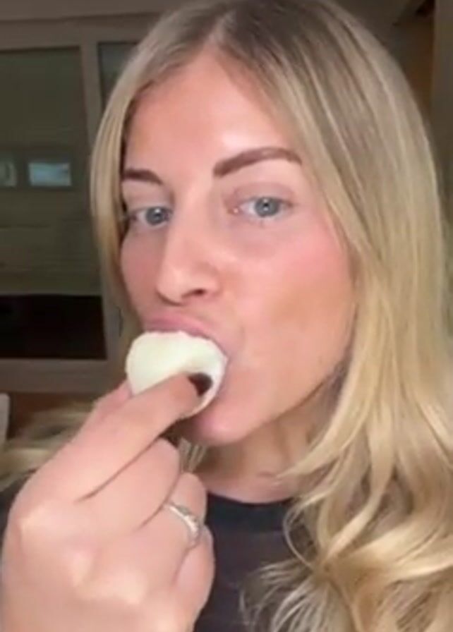 A fair-skinned blonde woman puts a chunk of white food in her mouth