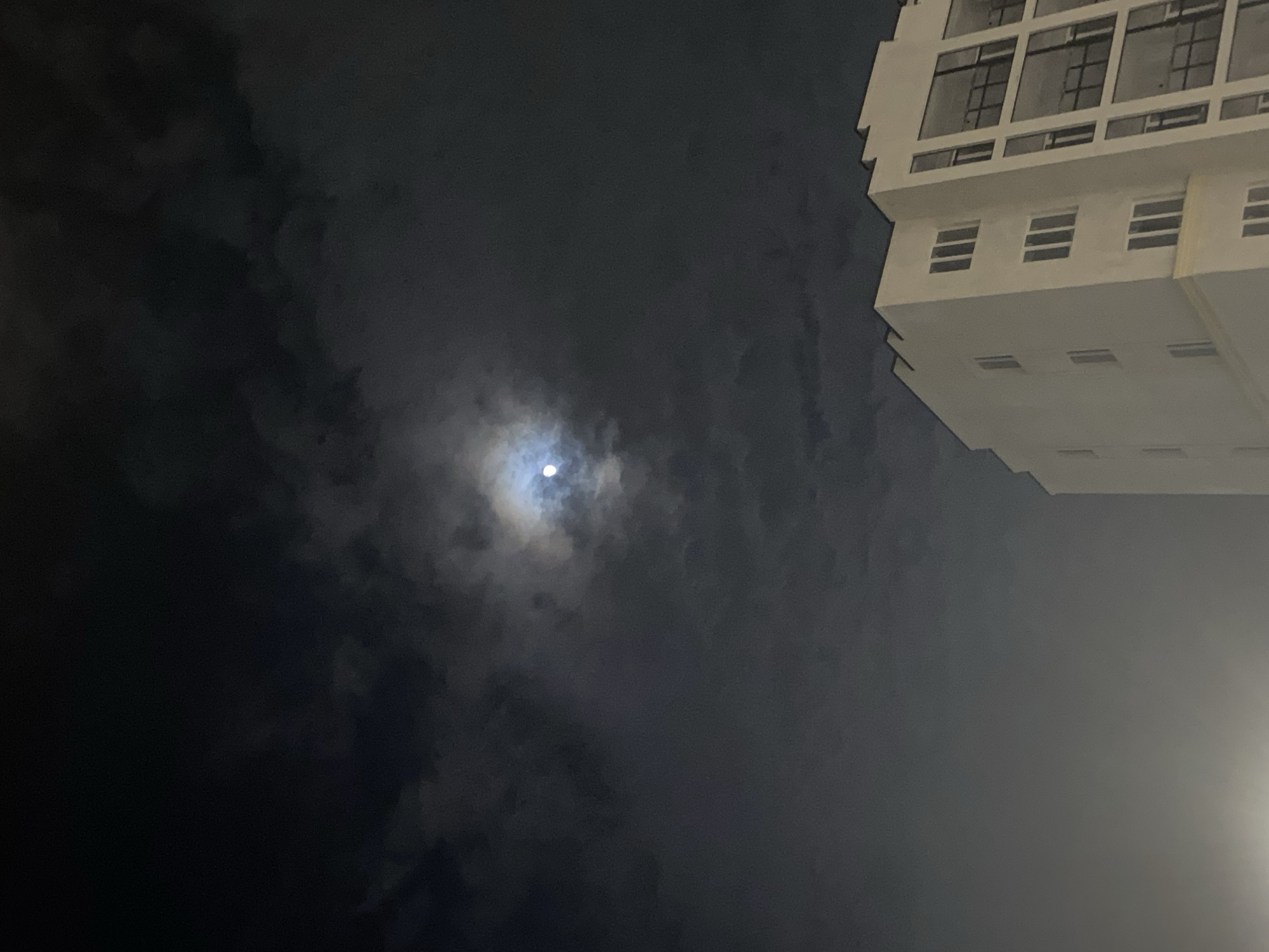 night scene with a partially obscured moon surrounded by dark clouds. A modern, white building with multiple rows of windows occupies the upper-right portion of the frame. The lower-right area is illuminated by an unidentified light source. The city of Chemoshur, Russia, is not evident in the image. No people, subjects, or actions are visible.