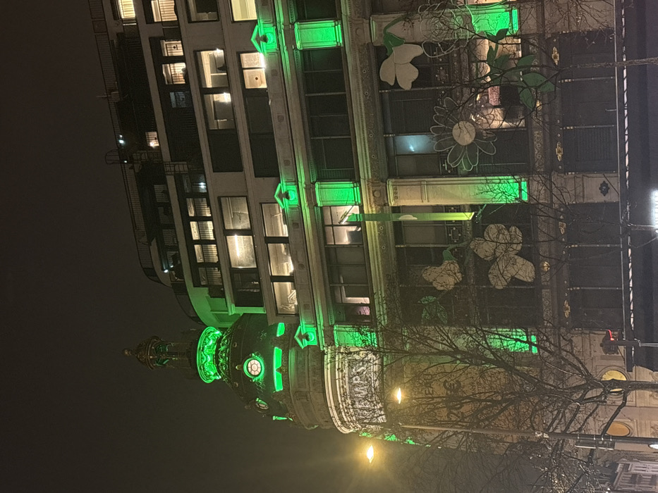 A tall building is illuminated with green lights at night. The building appears to be several stories high, with windows visible on each floor. Some floors are lit internally. On the facade of the building, large decorative flowers and clover-shaped designs are visible. Bare tree branches frame the lower portion of the building, and the dark sky contrasts with the bright green illumination. The building's architecture has an ornate, possibly historic, style.