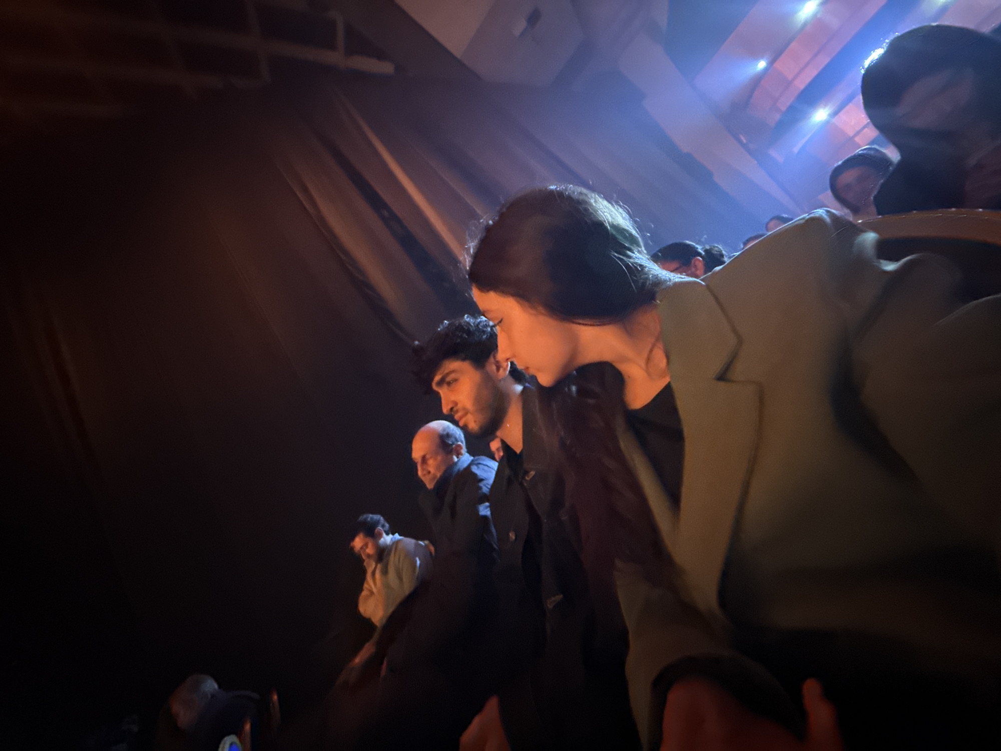 A low-angle, slightly blurry shot of people seated indoors, possibly in a theater or concert hall