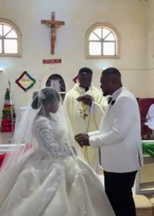 wedding ceremony taking place inside a church. A bride wearing a large, white ballgown with lace sleeves and a long veil sits facing the groom, who is dressed in a white suit. A priest stands between them, blessing a ring held by the groom. The church has a crucifix on the wall and a decorated Christmas tree in the background. There are arched windows on either side. The bride and groom are the main focus, and the priest leads the ceremony.