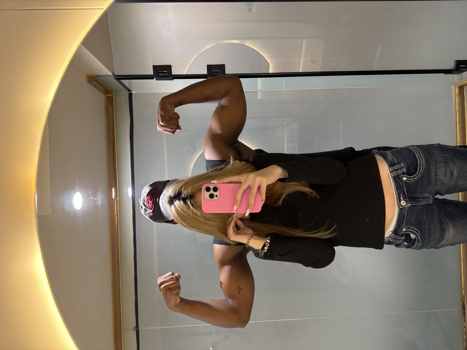 A mirror selfie shows a man with a baseball cap, black shirt, and muscular arms flexing