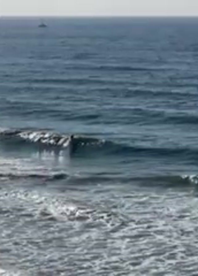 wide shot of a beach with waves rolling in. In the distance, there are a few sailboats on the ocean. Closer to the shore, there are several surfers riding the waves. The water is a deep blue color and the sky is clear. The overall scene appears calm and sunny.