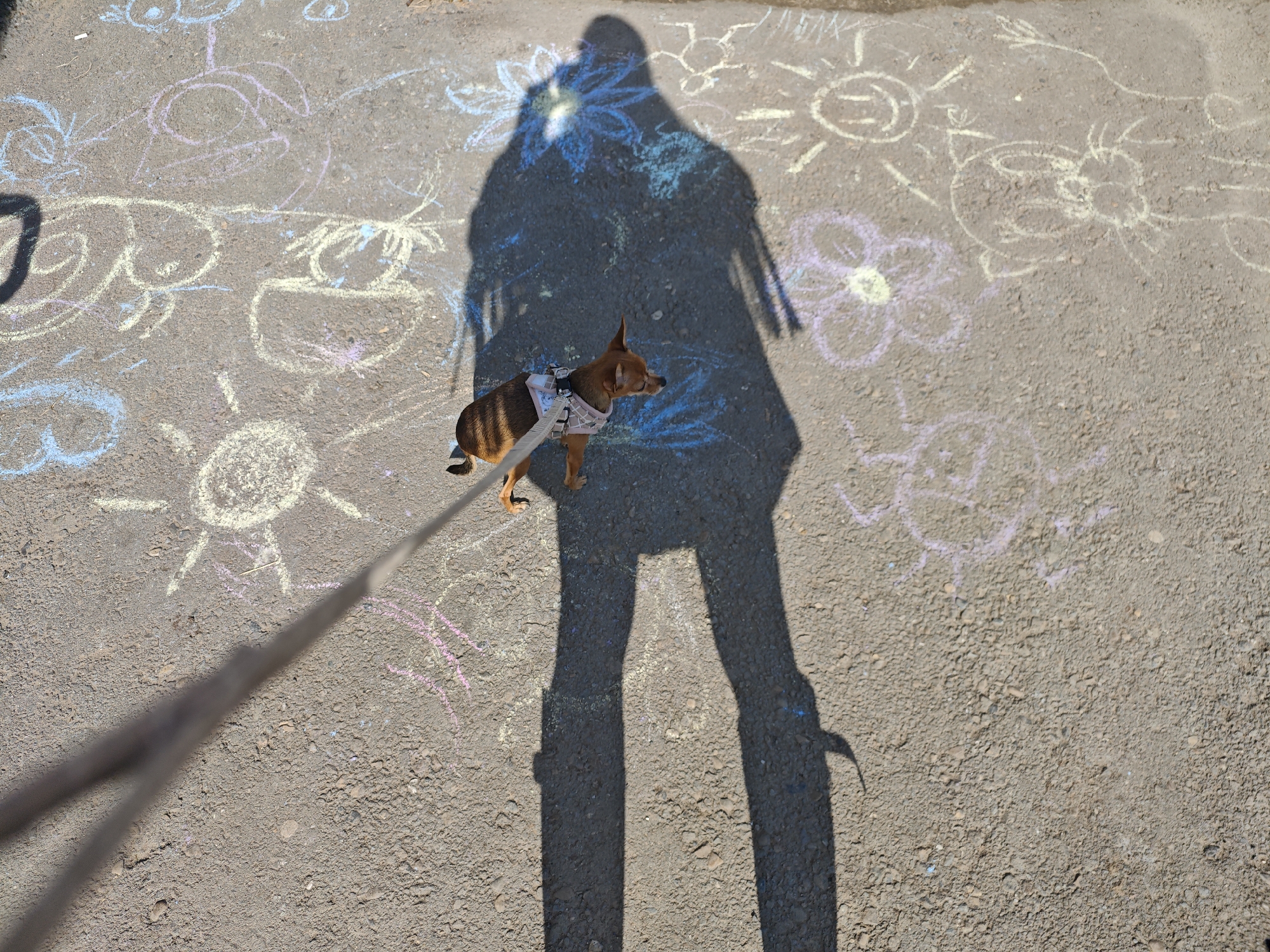 dog on a leash standing on an asphalt surface covered in children's chalk drawings