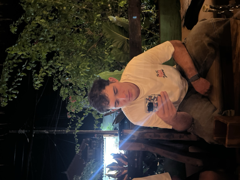 A young adult male, identified as Caucasian, is seated outdoors at night in Uluwatu, Indonesia