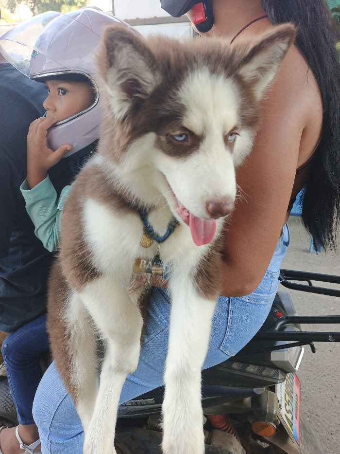A brown and white husky with blue eyes sits on a person's lap, its tongue hanging out. The person wears light blue jeans and a brown top. To the left, a child wearing a purple helmet looks to the side. The scene appears to be on a motorcycle with a partially visible license plate. The image is taken outdoors with a slightly tilted angle.