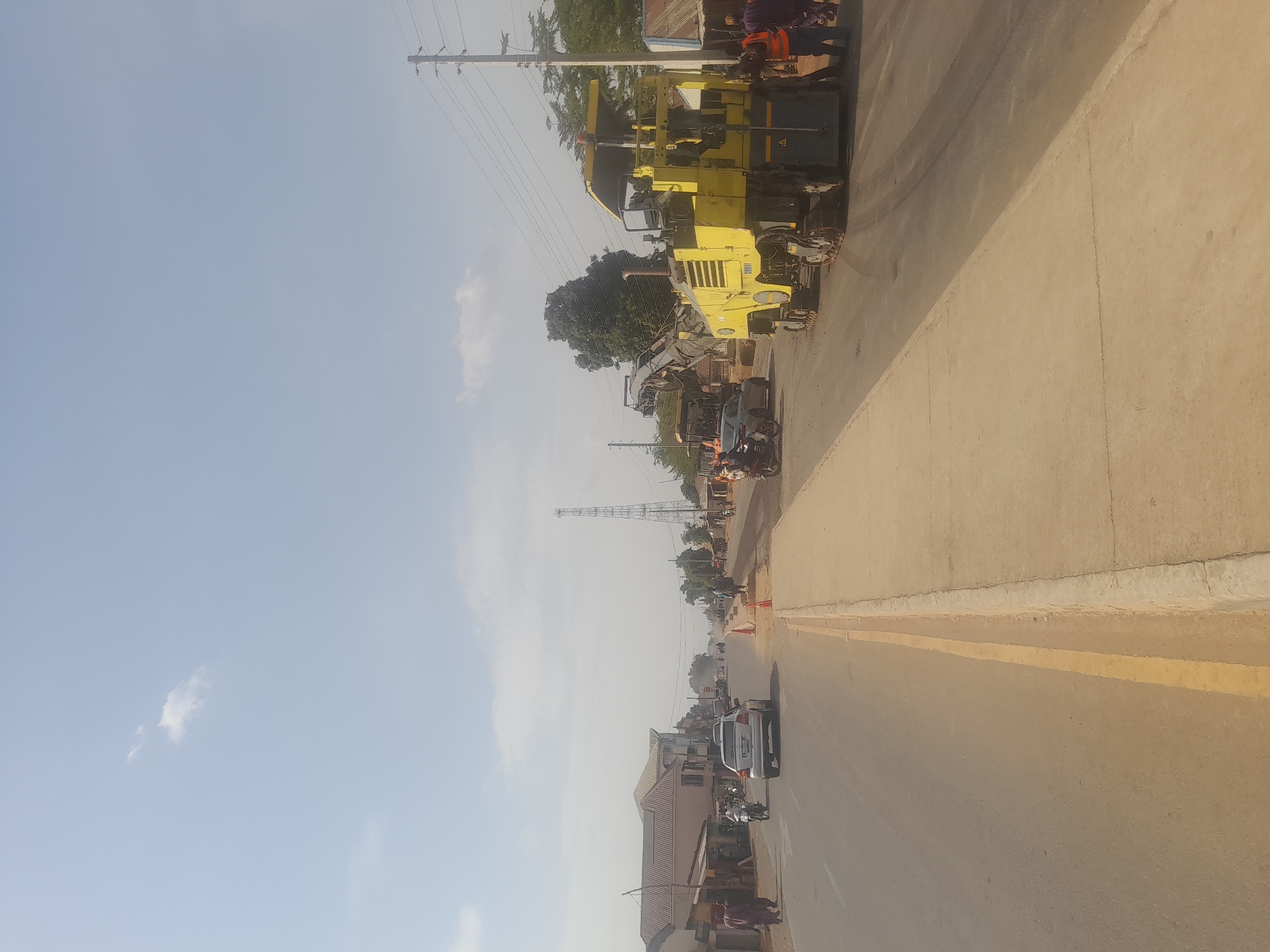 The scene captures a daytime view of a road construction site in Ube, Nigeria, under a light blue sky with minimal scattered white clouds and visible atmospheric haze