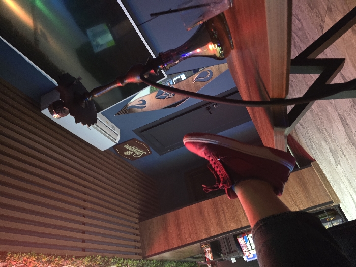 The image captures an interior scene, oriented at an oblique angle, depicting a human left leg and foot resting on a wooden table surface within a lounge or shisha bar setting