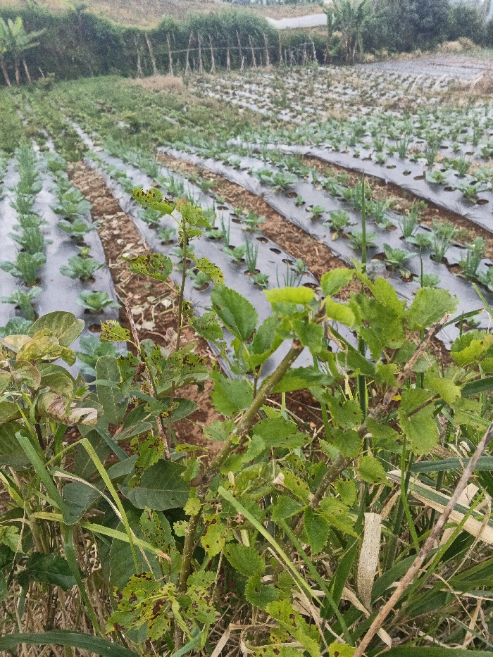This image depicts an outdoor agricultural field in Khna, Cambodia. In the foreground, a dense cluster of green foliage is present, featuring a multi-stemmed plant with numerous green leaves, some of which exhibit dark spot lesions. Dry grass and other green herbaceous vegetation are intermingled at the base. The midground reveals a cultivated area comprising multiple parallel rows of crops. Each row features black plastic mulch laid over the soil, from which young plants emerge. Specifically, two distinct crops are visible: rows of small, spherical green plants consistent with young cabbage, and adjacent rows of slender, upright green shoots resembling spring onions or similar alliums. Exposed reddish-brown soil is visible in the furrows between the mulched rows. In the background, the field extends further, showing additional, less distinct rows of crops leading to a dense treeline or forested area on a slightly elevated terrain. Several vertical wooden stakes or supports are visible within the background vegetation. No human or animal subjects are present.