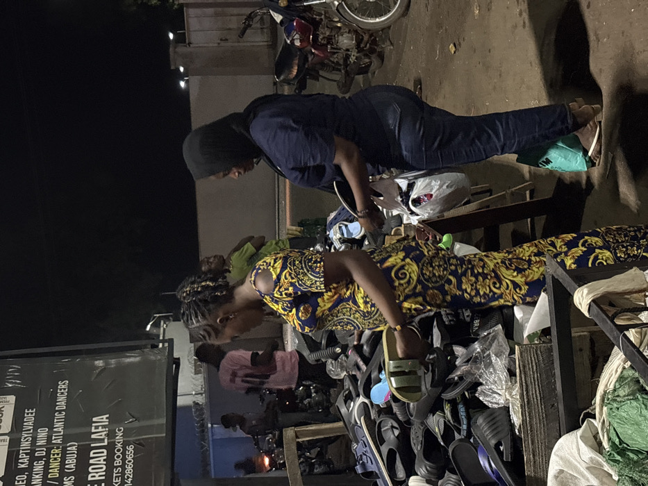 Two women browse a shoe display. The woman on the right wears a patterned blue and gold dress. The woman on the left wears a hijab and denim attire. The display contains various styles of sandals. A sign in the background advertises video, music, and dancing services, with the text "ROAD LAFIA" and a booking phone number visible. Additional people are present behind the shoe display.