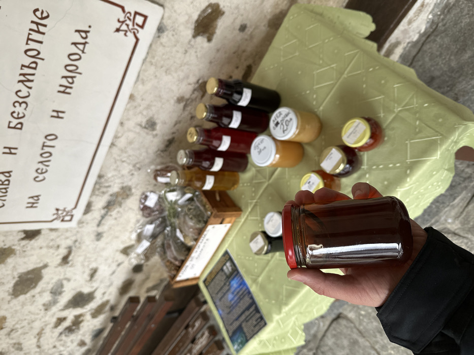The scene is an outdoor vendor stall in Shiroka Laka, Bulgaria