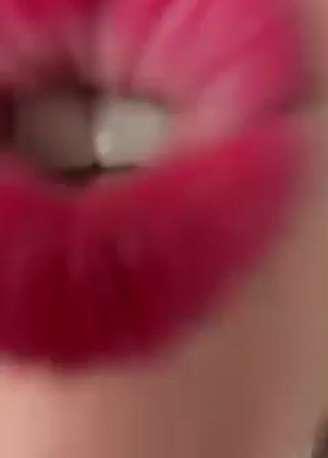 A woman with long brown and blonde hair, wearing a gray hoodie and bright pink lipstick, is seen from a close-up angle. She initially makes a kissing face, then smiles at the camera. The background appears to be a neutral wall.