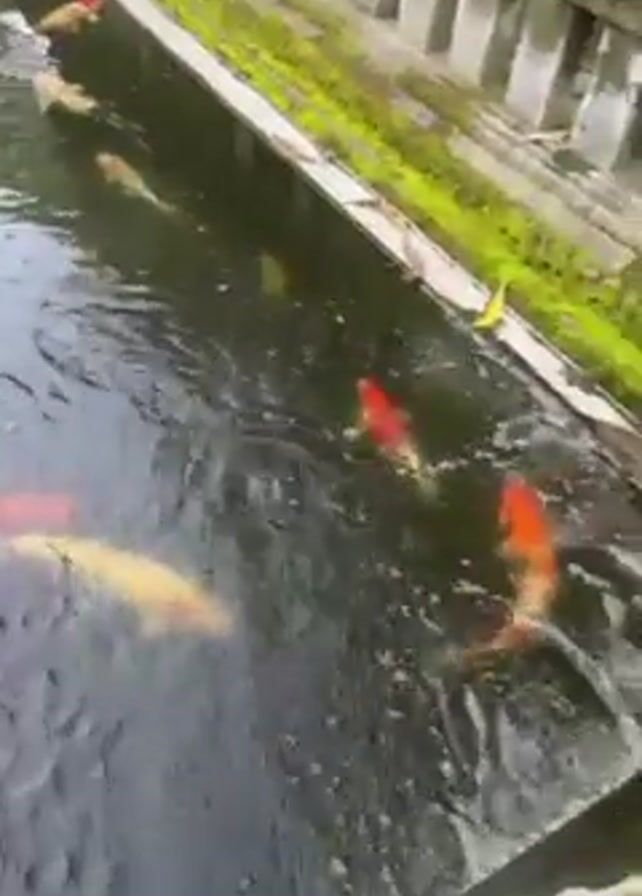 koi pond with many colorful koi fish swimming around. The pond is surrounded by a stone structure covered in moss. There are some lily pads floating on the water. The pond appears to be part of a larger structure or garden.