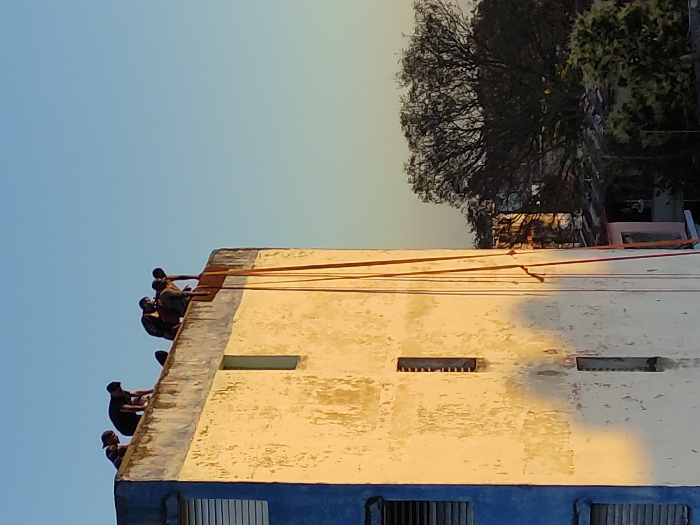 A sunlit building presents a group of individuals perched along its rooftop edge. The building's façade features a textured, weathered appearance, highlighted by blue accents at the base and interspersed rectangular openings. A cluster of trees looms behind the structure, casting shadows across the building's surface and contrasting with the clear blue sky. Orange cords run across the building near the rooftop.