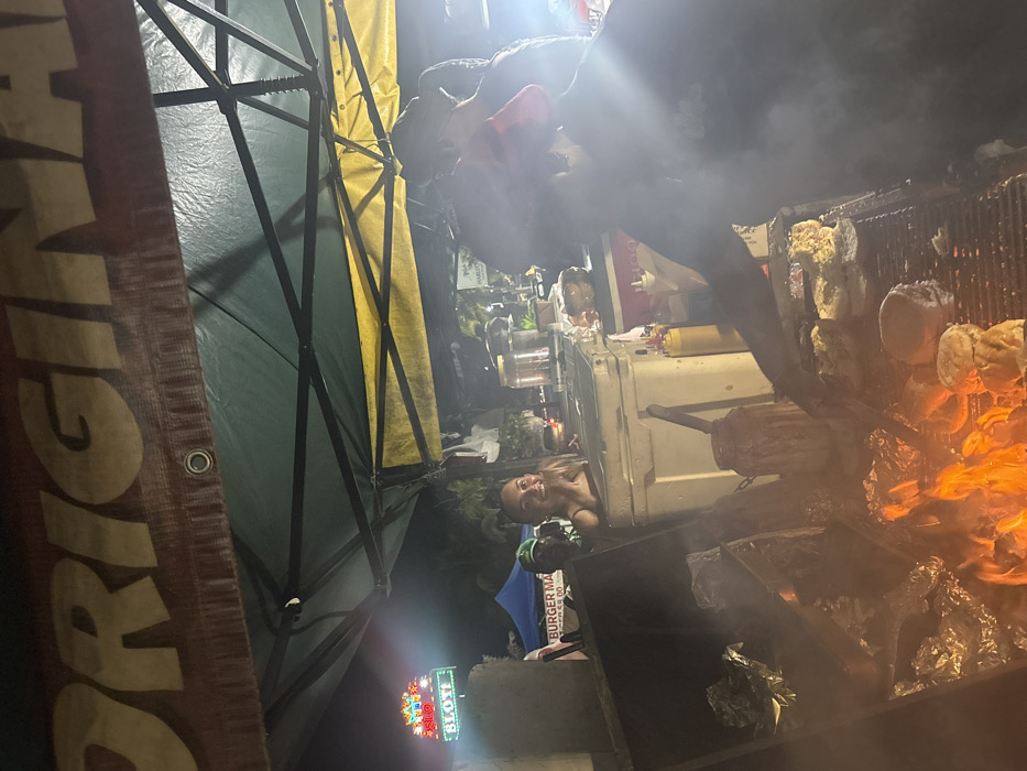 A food stall with open flames and smoke displays a grill piled with bread rolls. A person tends the grill. A woman is visible inside the stall's covered area, seemingly part of the staff. Signage and lettering are evident on the stall's exterior, suggesting a commercial establishment. A tent structure frames the stall, and a brightly lit sign is visible in the background.