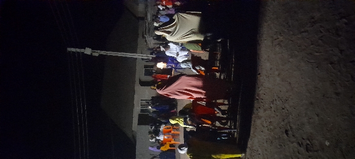 A gathering occurs outdoors at night. Many people are seated on orange chairs, some covered in blankets of various colors. A building is behind the group, and a utility pole with wires stands nearby. The scene is dimly lit, creating shadows and making details difficult to discern. The ground appears to be dirt or gravel.