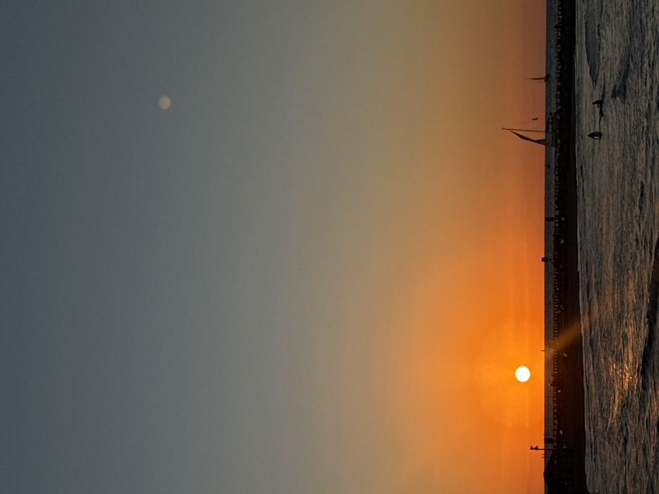 A picturesque scene captures a vivid sunset. The sky transitions from a soft grey to a radiant orange where the sun sets, creating a vibrant gradient. A faint, circular shape is visible in the grey portion of the sky, perhaps the moon. At the horizon line, silhouetted boats and other structures are seen, alongside a shoreline with waves lapping against it. The overall ambiance suggests a serene and tranquil moment at dusk.