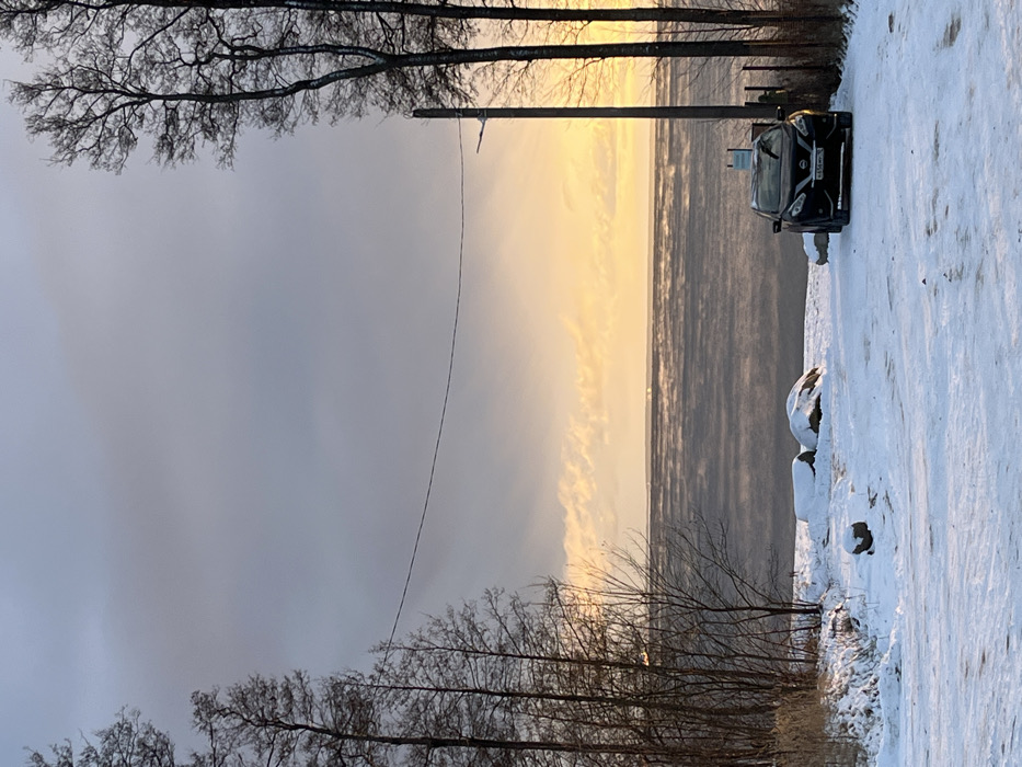 The scene depicts a snowy winter landscape at Finskiy Briz, Russia, during what appears to be either sunrise or sunset. The sky transitions from an overcast grey overhead to a bright yellow-orange glow at the horizon, illuminating a wide body of water in the midground. Mist or fog is actively rising from the surface of the dark, calm water. The foreground is covered with a uniform layer of white snow, with a track or path leading towards the water. Bare, leafless deciduous trees with dark trunks and branches frame the image on both the left and right sides. On the right side of the snowy path, a black Nissan SUV is parked, angled slightly towards the viewer. The vehicle displays Russian license plate 'В156МН 178' and has its front windshield wipers in the raised position. Immediately to the right of the parked vehicle stands a dark utility pole with a small, angled light fixture mounted near its top. A single dark wire spans horizontally across the upper midground, connecting the trees on the left to the utility pole on the right. Several large rocks, partially covered in snow, are visible along the snowy bank near the water's edge on the left side of the frame. No individuals are present within the scene.