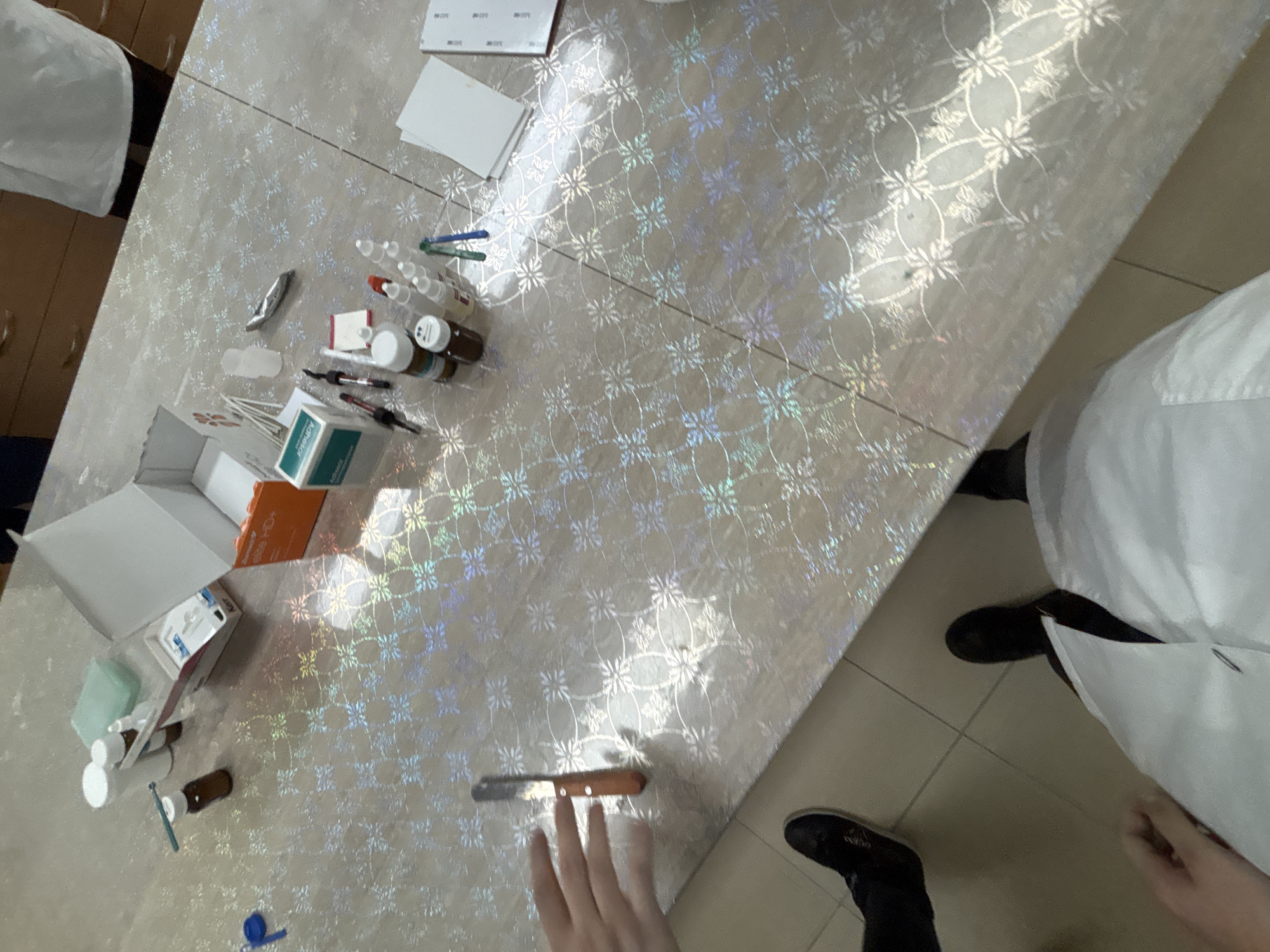The image depicts a tabletop scene, likely inside a medical or laboratory setting. The table has a patterned, reflective surface. Various medical supplies are scattered across the table, including vials, syringes, medicine bottles, an open test kit box, and various diagnostic test components. A gloved hand reaches toward a surgical scalpel with a wooden handle resting near the edge of the table. A person wearing a white lab coat stands to the right of the table. The floor is tiled, with a pair of black sneakers and dark-colored pants legs visible. The scene does not provide definitive information for pinpointing a location in Varna, Bulgaria.