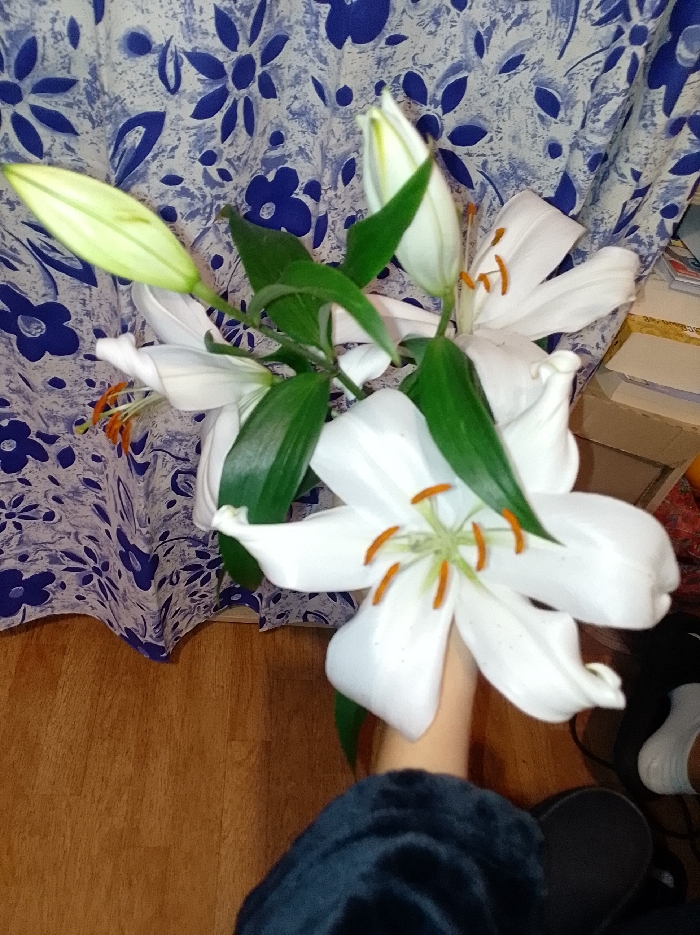 An indoor scene in Unknown, Unknown, shows a human hand holding a bouquet of white lilies. The hand, positioned centrally, holds several fully bloomed white lilies, each featuring six petals and prominent orange-tipped anthers. Multiple pale green lily buds are also present within the bouquet, interspersed with dark green, lance-shaped leaves. The background consists of a light-colored fabric with a repeating blue floral pattern, likely a curtain or tapestry. Below the lilies, a wooden floor with light brown planks and visible grain extends across the lower portion of the frame. On the far right, a human foot is partially visible, wearing a dark slipper and a white sock. Indistinct stacked objects, possibly cardboard boxes, are visible behind the foot on the right side of the floor. The hand holding the flowers is partially obscured by dark, possibly plush, fabric.