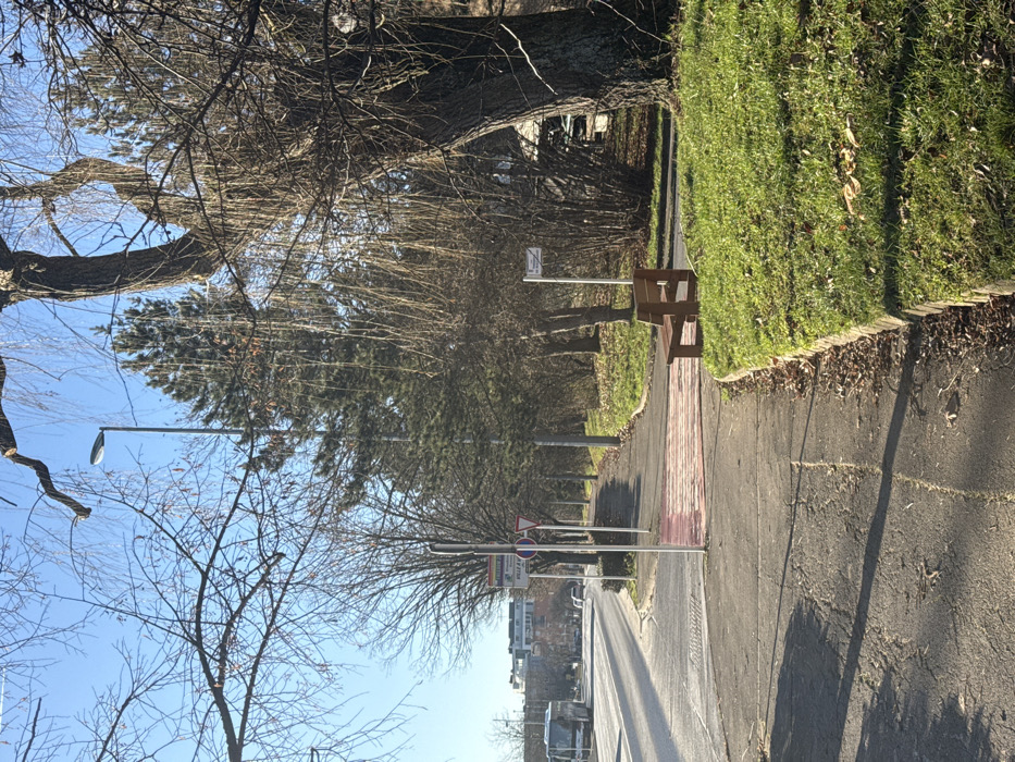 The image displays an outdoor urban environment in Esch-sur-Alzette, Luxembourg, under a clear, sunny sky with distinct shadows. The perspective is from a paved sidewalk looking northeast along a multi-lane asphalt road. On the left, the asphalt road features white lane markings. A white city bus is visible in the leftmost lane in the mid-ground, moving away from the viewer, accompanied by several smaller passenger vehicles further down the road. Parallel to the road, a concrete sidewalk shows minor cracks and wear. Multiple street signs are present on poles; one rectangular sign displays "EMSCH - ESCH-SUR-ALZETTE" and "VILLE D'ESCH," positioned next to a triangular red-bordered "Give Way" sign. A tall street lamp with an oval fixture rises behind these signs. On the right, a green grassy area with scattered brown leaves borders the sidewalk. A light brown wooden park bench, with a slatted back and seat, is situated on the grass, facing slightly left. A pathway constructed of reddish-brown pavers connects the bench area to the concrete sidewalk. A large tree with a thick, gnarled trunk and numerous bare, drooping branches occupies the far right foreground. Behind this, a dense line of trees, including bare deciduous and evergreen conifers, forms a backdrop. A white sign on a pole is partially visible within this treeline. No individuals are present in the scene.