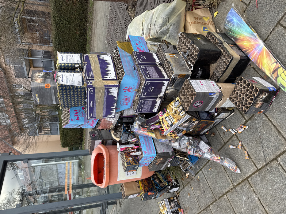 The image depicts a public sidewalk on Glasgowstraße in Nuremberg, Germany. A substantial pile of discarded fireworks packaging and debris occupies the foreground, positioned against an orange public waste bin and a bus stop shelter. The pile consists primarily of cardboard boxes, many exhibiting charring and containing empty cylindrical firework tubes, indicating prior use. Identifiable brands on the packaging include "KING," "SNOWFIRE," "AZUR," "ULTIMATE FINGER 500," "Harmonia," and "Valentín." Scattered small firework remnants and a rainbow-colored firework box lie on the grey paver stones. To the right, several plastic bags, one marked "Edeka," are visible. In the background, multi-story residential buildings with balconies are visible beyond leafless trees and a green hedge. No individuals are present in the scene.