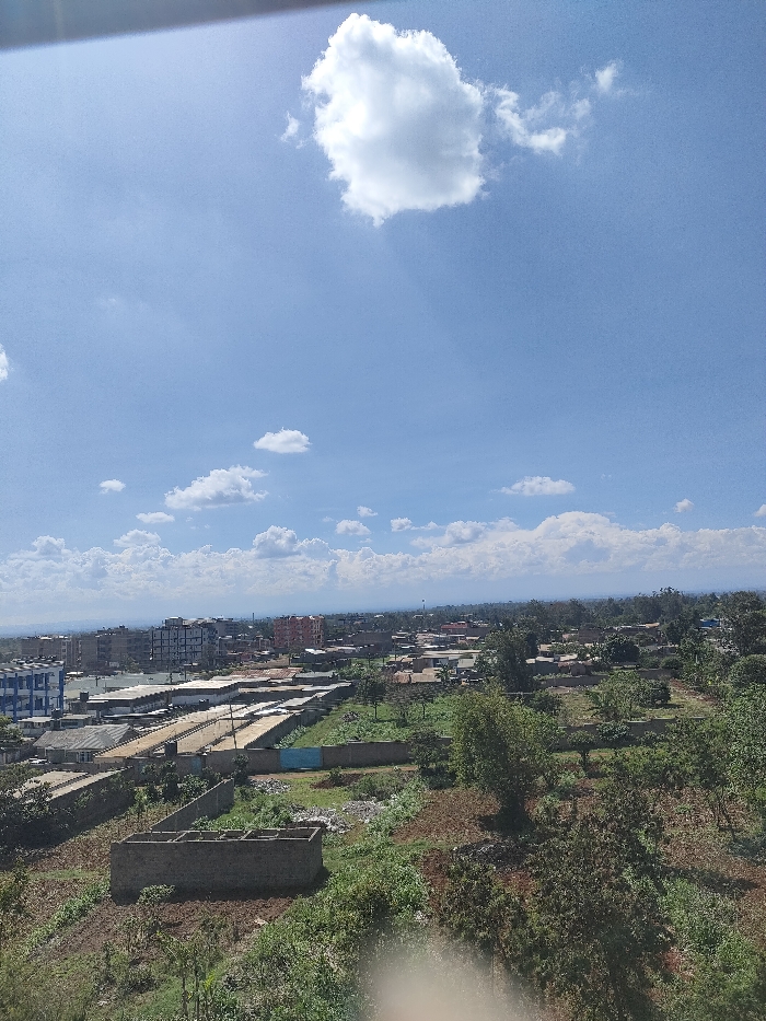 An elevated panoramic view captures a section of Juja ward, Kenya, under a clear blue sky dotted with scattered cumulus clouds, including a prominent large cloud in the upper left