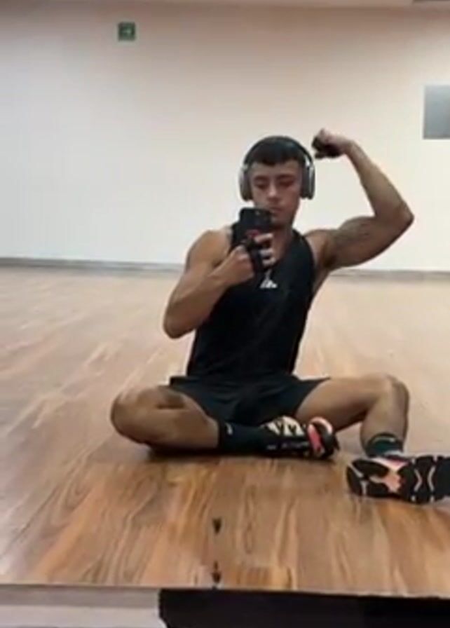 In a medium shot taken from a lower angle, a young man is seen sitting on the floor of what appears to be a gym or dance studio. He is cross-legged, facing towards a mirror where the camera is positioned. The man is wearing a black tank top, black shorts, black socks, and athletic shoes with a black, orange, and red pattern. He has headphones on his head and is holding a smartphone in his left hand, presumably taking a selfie. He flexes his right bicep and smiles faintly at the camera. The floor is made of wood-look laminate. In the background, the walls are plain white, with a small sign visible on the upper right. The bottom edge of the mirror is partially covered with what appears to be black paint. The lighting is bright and consistent throughout the scene.