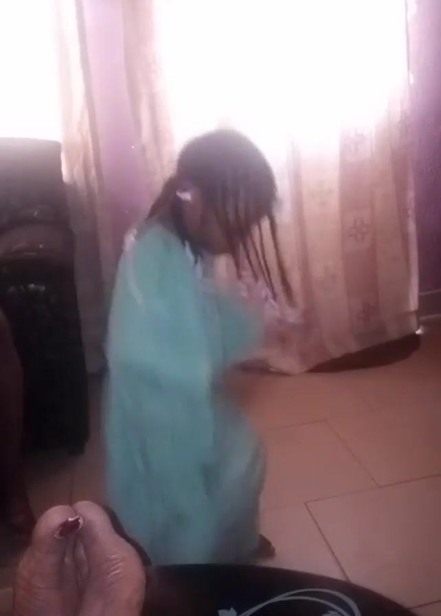 A young child with braided hair, wearing a light blue garment, is dancing in a room. The room has tiled floors and curtains. The feet of a person sitting are visible in the foreground. Another child is partially visible in the background. A piece of furniture with a dark top is positioned in front of the seated person.