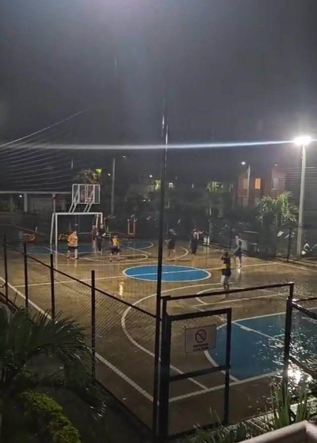 group of people playing basketball in the rain on an outdoor court at night. The court is illuminated by overhead lights, and there is a fence surrounding it. The court is wet and there are puddles. Some of the players are wearing shorts and t-shirts, while others are wearing warmer clothing. They are running and dribbling the ball, and some are attempting to shoot hoops. A sign saying "No Smoking" is visible. A railing is shown in the foreground, implying the video was taken from a balcony or elevated position. Vegetation is visible as well.