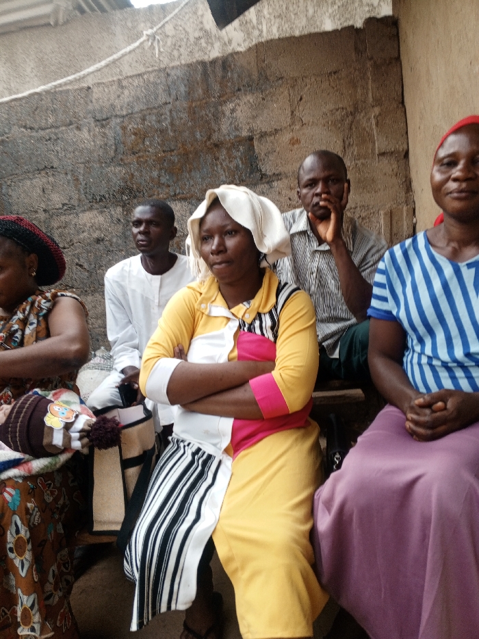 Five people are seated outside a building with a textured wall. The woman in the center wears a unique patchwork dress of yellow, white, black and white stripes, and pink. Her arms are crossed. To her left, a woman in a floral print dress holds a patterned blanket. A man in white sits next to her. Behind the central woman, a man in a striped shirt rests his chin on his hand. To the right, a woman in a blue and white striped shirt and a purple skirt sits with her hands clasped.